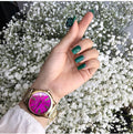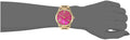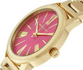 Gold-tone stainless steel case and bracelet. Fixed gold-tone bezel. Pink mother of pearl dial with gold-tone hands and alternating Roman numeral and index hour markers.