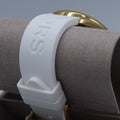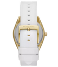 Michael Kors Janelle 42mm watch features a white dial with a gold-tone logo, three-hand movement and white logo-print silicone strap.