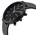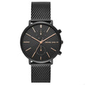 Make a strong style statement in the Michael Kors Jaryn watch. A polished black IP case and fluid mesh bracelet perfectly complement the black sunray dial with minimalist rose gold-tone stick indexes and sub dials.