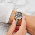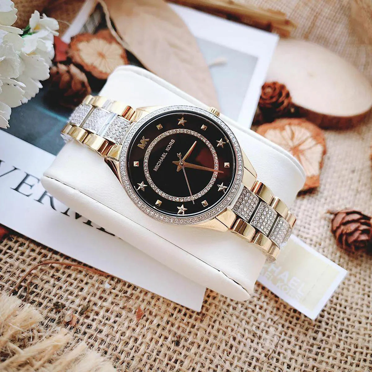 A study in timeless glamour, MK's Lauryn watch is designed in gleaming two-tone stainless steel with stars and squares instead of numeral indexes. The bracelet strap and bezel are lined with sparkling pavé crystals for a brilliant effect.