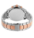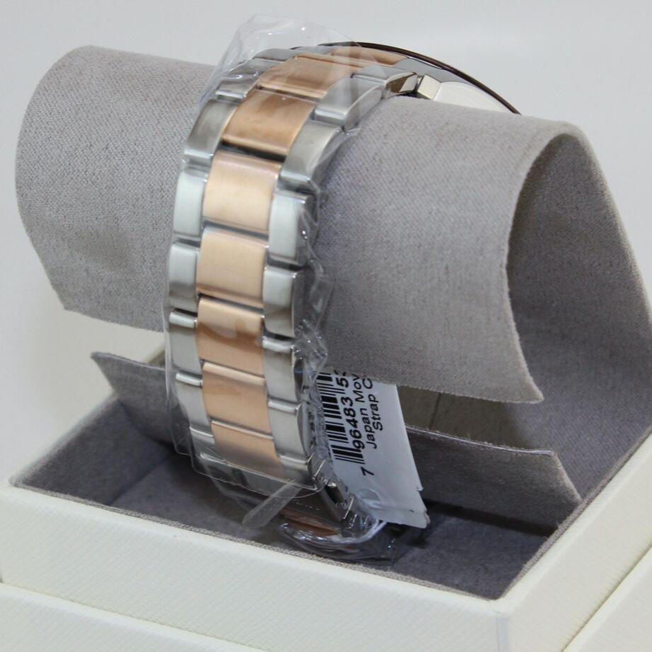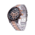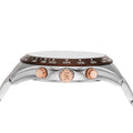 Stainless steel case with a two-tone (silver-tone and rose gold-tone) steel bracelet. Fixed brown-plated bezel displaying tachymeter markings. Black dial with luminous rose gold-tone hands and small Arabic numeral index/hour markers. Minute markers around the outer rim. Dial Type: Analog. Luminescent hands and markers. Date display between the 4 and 5 o'clock positions. Chronograph: Three subdials displaying: 60 second, 30 minute, and 24 hour. Quartz movement.
