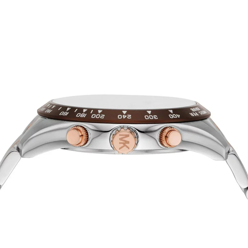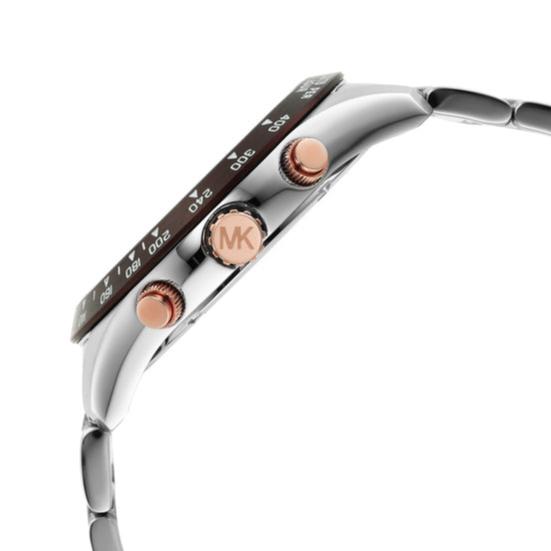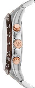 Michael Kors' 45mm Layton watch features a black dial, silver case with chocolate topring, chronograph movement and two-tone stainless steel bracelet.