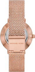 A true style statement, this voguish Rose Gold Michael Kors women’s Watch will definitely amp up your fashion quotient. Michael Kors' Pyper 32mm watch features a white mother-of-pearl dial with rose gold-tone stick indexes, rose gold-tone case with a pave topring, two-hand movement, and crystal mesh rose gold-tone stainless steel bracelet. Ace your overall look by wearing this timeless piece of accessory again and again.