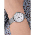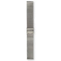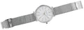 Stainless steel case with a stainless steel mesh bracelet. Fixed stainless steel bezel. Silver dial with silver-tone hands and crystal-tipped index hour markers. Minute markers around the outer rim. Dial Type: Analog. Quartz movement. Scratch resistant mineral crystal. Pull / push crown. Solid case back. Round case shape.