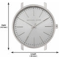 Case size: 38 mm. Case thickness: 7 mm. Band width: 18 mm. Fold over slip through clasp. Water resistant at 50 meters / 165 feet. Functions: hour, minute, second. Casual watch style. Watch label: Japan Movt. Michael Kors Pyper Quartz Crystal Silver Dial Ladies Watch MK4338.