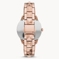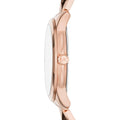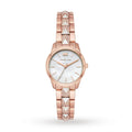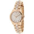 Rose gold-tone stainless steel case with a rose gold-tone stainless steel bracelet set with crystals. Fixed rose gold-tone bezel. Mother of pearl dial with rose gold-tone hands and index hour markers. Dial Type: Analog. Quartz movement.