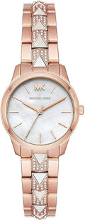 This 28mm Runway watch features a white mother-of-pearl dial with rose gold-tone stick indexes, three-hand movement and rose gold-tone stainless steel bracelet with mother-of-pearl and glitz center-links.