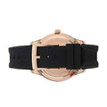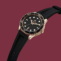 Round stainless steel case with a black dial. black silicone band with clasp closure