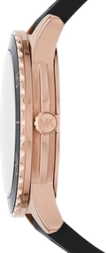 Fashionable women's watch Michael Kors Runway MK6852 created by a famous designer. The case with a diameter of 40 mm and a thickness of 10 mm is made of high-quality steel and is suspended on a plastic strap. The stainless steel is covered with a rose-gold coating, which guarantees high resistance to abrasion. The dial is marked with hands and a large manufacturer's logo. This model is equipped with an accurate quartz mechanism powered by a battery. The watch's bezel is finished in a very interesting way. The 50M water resistance allows for minor contact with water, e.g. shower.