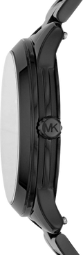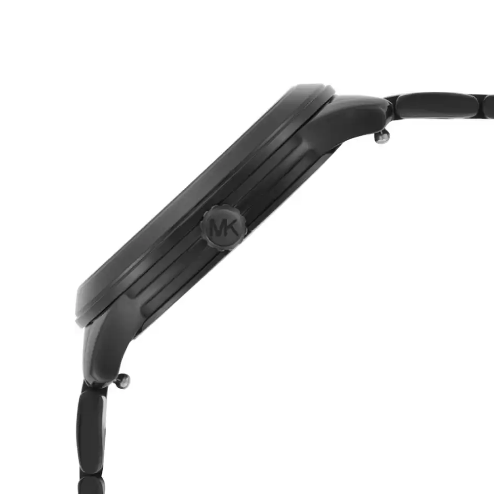An allover matte black look sets the stage for this Michael Kors watch, from the Runway collection. A logo-stamped dial adds a signature touch, while a black monotone stainless steel strap delivers a rich finish. This 38mm watch features a black dial in a stainless steel case with three hand movement.