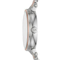 Stainless steel case with a two-tone (silver-tone and rose gold-tone) stainless steel bracelet. Fixed rose gold-tone bezel set with crystals. Rose crystal-set dial with rose gold-tone hands. Roman numerals appear at the 6 and 12 o'clock positions. Dial Type: Analog. Quartz movement.