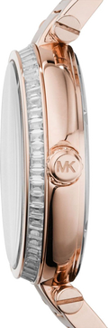 Rose gold-tone stainless steel case and bracelet. Fixed rose gold-tone bezel set with crystals. Red dial with rose gold-tone hands and Roman numeral hour markers. Minute markers around the outer rim. Dial Type: Analog. Small second sub-dial at the 6 o’clock position. Quartz movement. Scratch resistant mineral crystal. Pull / push crown. Solid case back. Case diameter: 42 mm. Case thickness: 12 mm. Round case shape. Deployment clasp. Water resistant at 50 meters / 165 feet. Functions: hour, minute, small second. Casual watch style. Michael Kors Skylar Red Dial Rose Gold Steel Ladies Watch MK6086.
