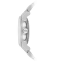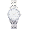 Stainless steel case with a stainless steel bracelet. Fixed stainless steel bezel. Mother of pearl dial with silver-tone dauphine-style hands and diamond hour markers. Minute markers around the outer rim. Dial Type: Analog. Date display between the 4 and 5 o'clock positions. ETA caliber 2671 automatic movement, containing 25 Jewels, bitting at 28800 vph, and has a power reserve of approximately 38 hours.