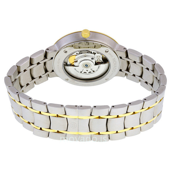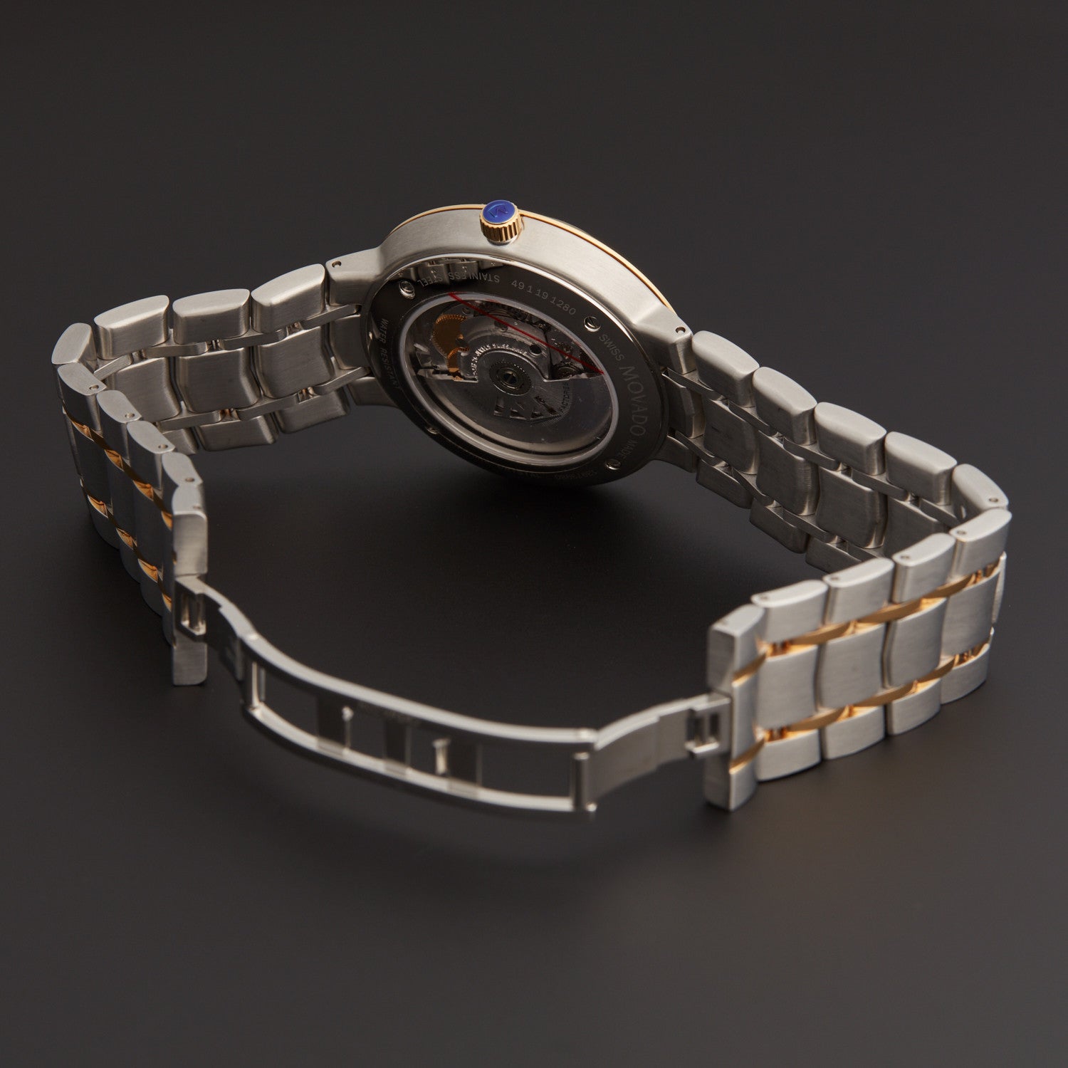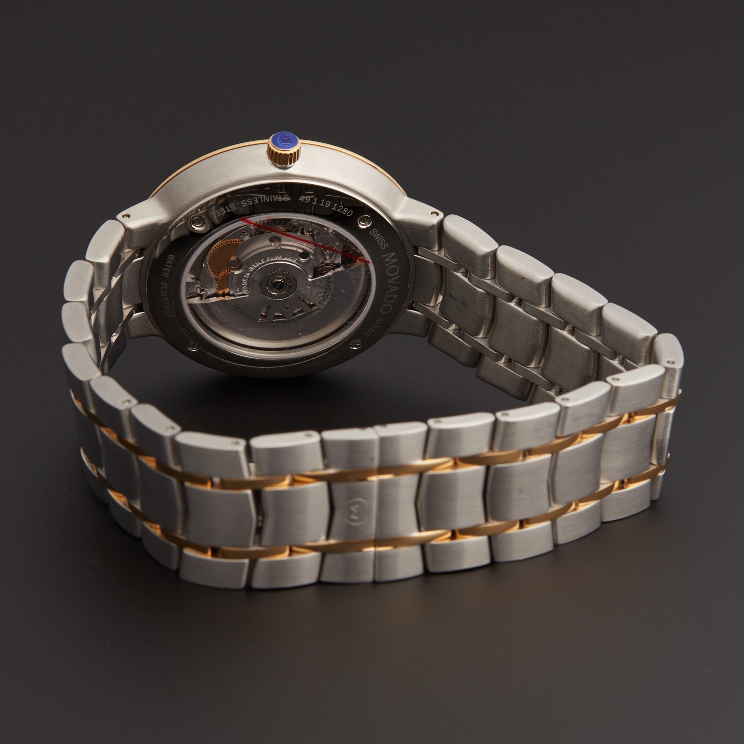 Movado Watch 1881 Automatic 606916. Mens 1881 Automatic watch, 39.5 mm stainless steel and yellow gold PVD finished case with exhibition back, round bi level black 3 hand dial with gold toned dot and hands, stamped hour markers and minute index, gold toned accents and round date display, two toned stainless steel bracelet with chevron shaped links and butterfly deployment clasp.