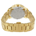Yellow gold PVD stainless steel case and bracelet. Fixed yellow gold PVD bezel. Black dial with gold-tone hands. No markers. The Movado dot appears at the 12 o'clock poisition. Dial Type: Analog. Quartz movement. Scratch resistant K1 mineral crystal. Pull / push crown. Solid case back. Case size: 36 mm, case thickness: 9.2 mm. Round case shape. Band width: 20 mm. Deployment clasp with a push button release. Water resistant at 30 meters / 100 feet. Functions: hour, minute. Dress watch style. Movado Bold Black Dial Gold-tone Unisex Watch 3600397.