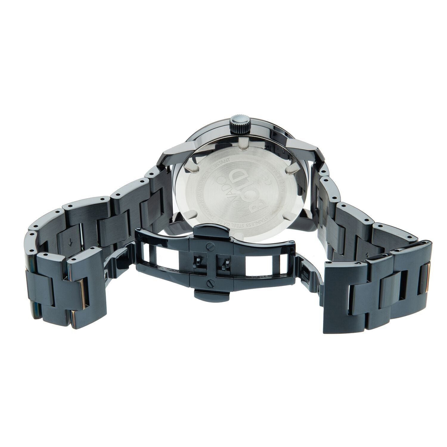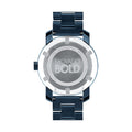 The clear crystal-set dot and ink blue hands on the ink blue sunray dial set the tone for this BOLD watch from Movado. A K1 crystal tops the 36mm ink blue ion-plated stainless steel case, and has a ring of highly reflective ink blue metallization. The BOLD watch features a Swiss quartz movement, and is water-resistant to 30 meters, while the ink blue ion-plated stainless steel link bracelet secures with a push-button deployment clasp.
