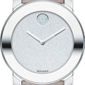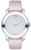 Stainless steel case with a blush leather strap. Fixed stainless steel bezel. Silver glitter dial with silver-tone hands. No markers. Crystal-set Movado dot appears at the 12 o'clock position. Dial Type: Analog. Quartz movement. Scratch resistant K1 mineral crystal. Pull / push crown. Solid case back. Round case shape. Case size: 36 mm. Case thickness: 8 mm. Band width: 18 mm. Tang clasp. Water resistant at 30 meters / 100 feet. Functions: hour, minute. Dress watch style. Watch label: Swiss Made. Movado Bold Silver Glitter Dial Ladies Watch 3600522.