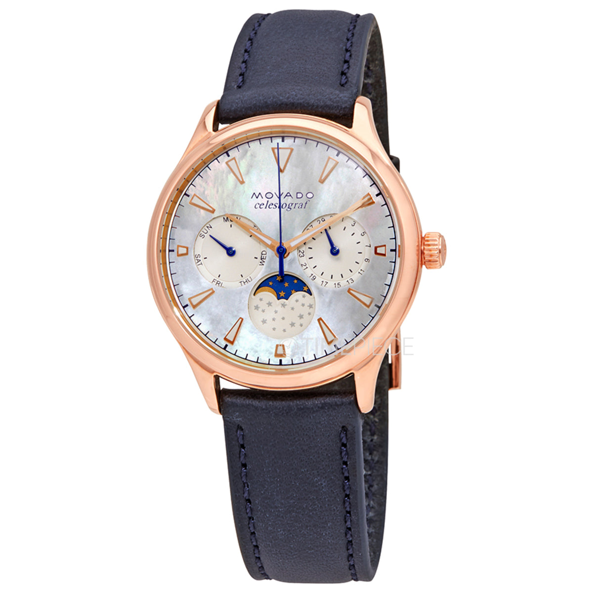 Rose gold PVD stainless steel case with a navy leather strap. Fixed rose gold PVD bezel. White mother of pearl dial with luminous rose gold-tone hands and index hour markers. Minute markers around the outer rim. Dial Type: Analog. Luminescent hands and markers. Date display at the 3 o'clock position. Three multi-function sub-dials displaying: date, moon phase, and day of the week. Quartz movement. Scratch resistant sapphire crystal. Pull / push crown. Solid case back. Round case shape. Case size: 36 mm. Case thickness: 9.48 mm.
