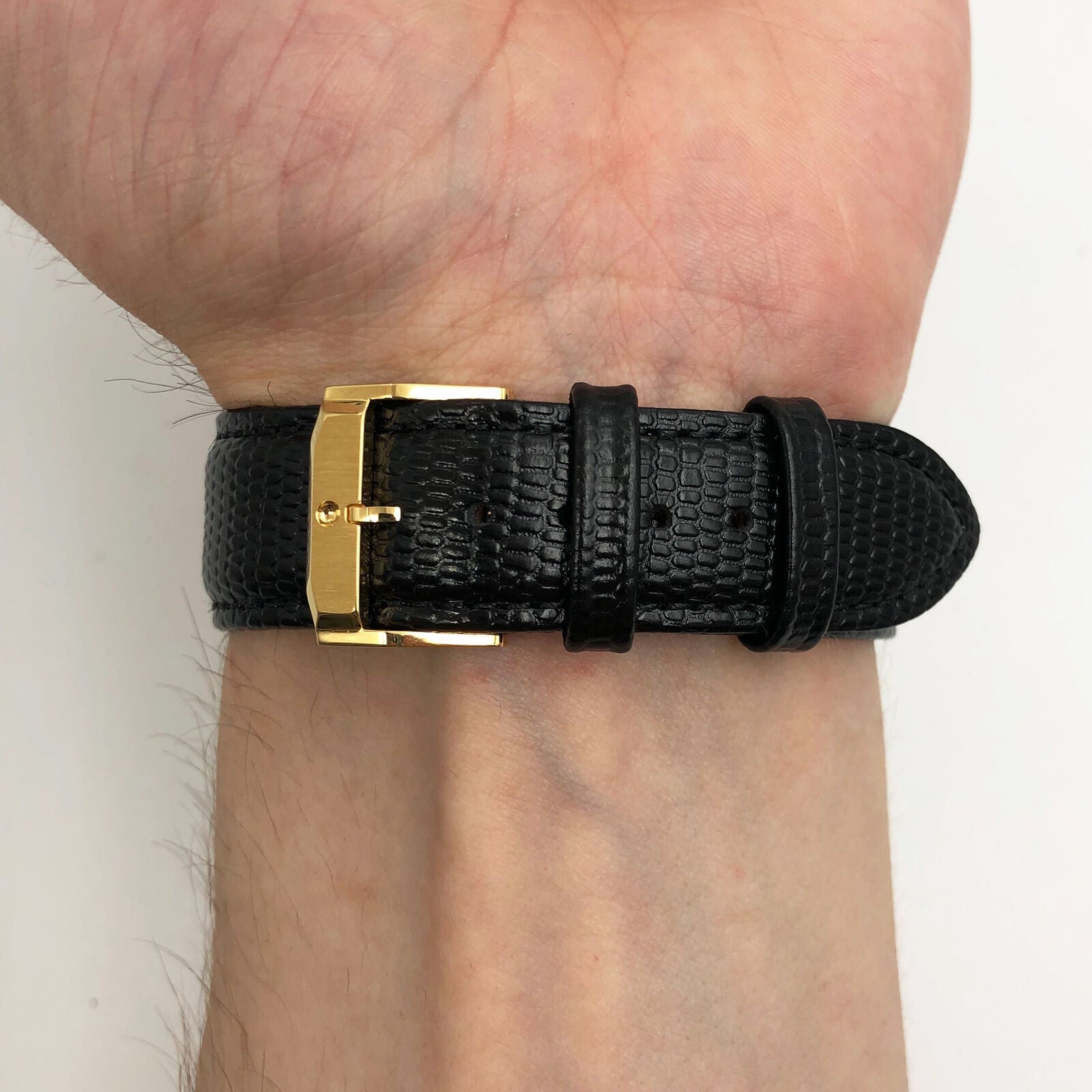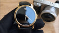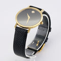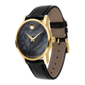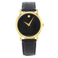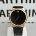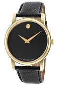Yellow gold-plated stainless steel case with a black leather strap. Fixed yellow gold-plated bezel. Black dial with yellow gold-tone hands. No markers. The Movado dot appears at the 12 o'clock position. Dial Type: Analog. Quartz movement. Scratch resistant K1 crystal. Pull / push crown. Solid case back. Case size: 38 mm. Case thickness: 7 mm. Round case shape. Band width: 21 mm. Band length: 7.5 inches. Tang clasp. Water resistant at 30 meters / 100 feet. Functions: hour, minute. Casual watch style. Watch label: Swiss Quartz. Movado Museum Black