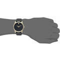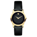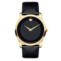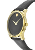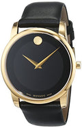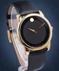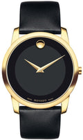Yellow gold PVD stainless steel case with a black leather strap. Fixed yellow gold PVD bezel. Black dial with gold-toned hands. The Movado dot appears at the 12 o'clock position. Dial Type: Analog. Quartz movement. Scratch resistant sapphire crystal. Solid case back. Case diameter: 40 mm. Round case shape. Tang clasp. Water resistant at 30 meters / 100 feet. Functions: hour, minute. Dress watch style. Movado Museum Black Dial Leather Mens Watch 0606876.
