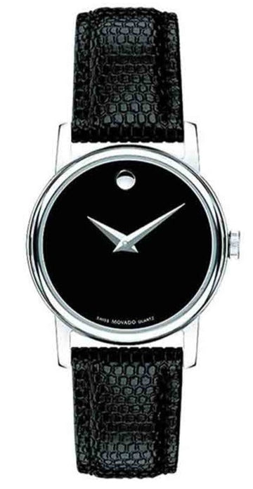 Case thickness: 7 mm. Round case shape. Bracelet width: 15 mm. Tang clasp. Water resistant at 30 meters / 100 feet. Functions: hours, minutes. Dress watch style. Watch label: Swiss Made. Movado Museum Black Dial Black Leather Strap Ladies Watch
