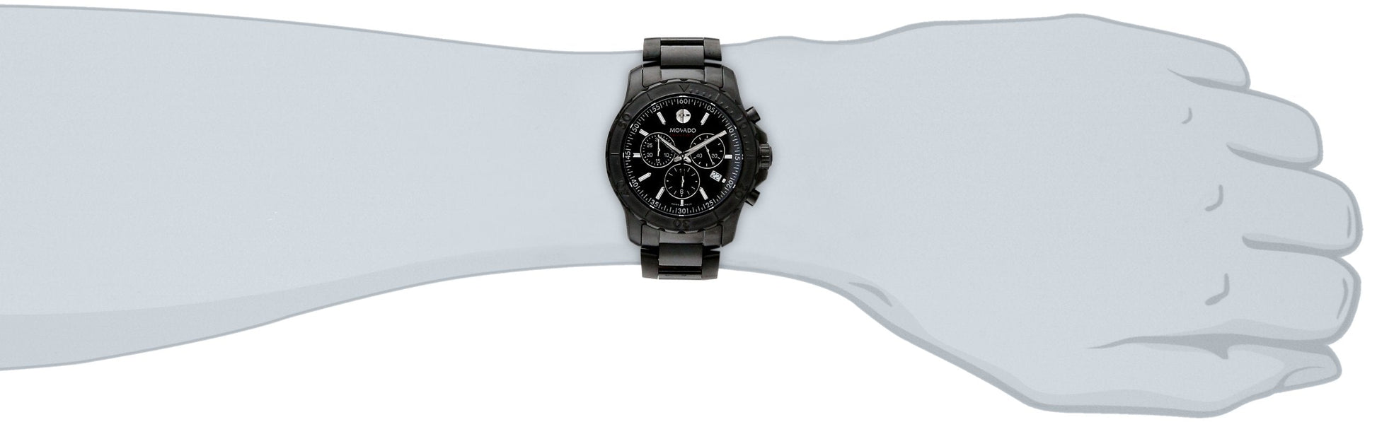 Black PVD stainless steel case and bracelet. Uni-directional rotating black PVD bezel. Black dial with silver-tone hands and stick hour markers. Movado dot marks the 12 o'clock position. Minute markers around the outer rim. Dial Type: Analog. Luminescent hands and markers. Date display at the 4 o'clock position. Chronograph - three sub-dials displaying: 60 second, 30 minute and 12 hour.