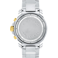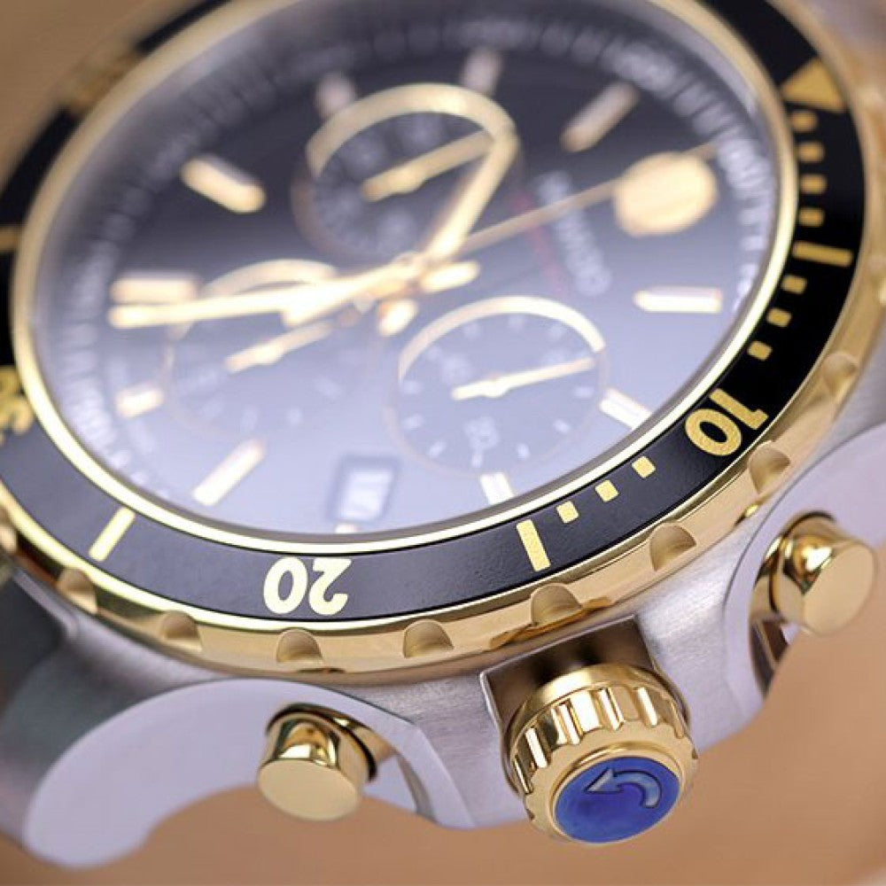 Yellow gold PVD stainless steel case with a two-tone (silver-tone and yellow gold PVD) stainless steel bracelet. Uni-directional rotating yellow gold PVD bezel with a black aluminum top ring. Black dial with luminous yellow gold-tone hands and index hour markers. Minute markers around the outer rim. The Movado dot appears at the 12 o'clock position. Dial Type: Analog. Luminescent hands and markers. Date display at the 4 o'clock position. Chronograph - three sub-dials displaying: 60 second, 30 minute and 12 hours.
