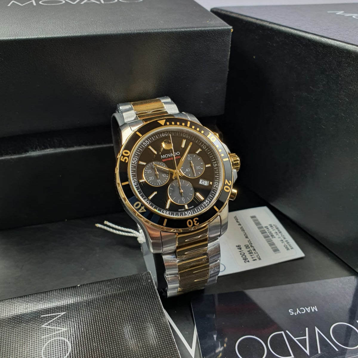 Movado Series 800 2600146 is a super attractive Gents watch. Case material is Two-tone steel/gold plate while the dial colour is Black. The features of the watch include (among others) a chronograph and date function. In regards to the water resistance, the watch has got a resistancy up to 200 metres. This means it can be used for professional marine activity, skin diving and high impact water sports, but not deep sea or mixed gas diving. We ship it with an original box and a guarantee from the manufacturer.