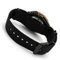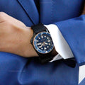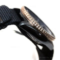 This beautiful watch features a round stainless steel, gold-plated, hard-coated bezel of the case with a fabric strap. The dial is blue with luminous hands and index hour markers. The date display and the day display are located at the 3 o'clock position. The crown is at the 4 o'clock position. It is powered by a 4R36 caliber and has a power duration of approximately 41 hours.