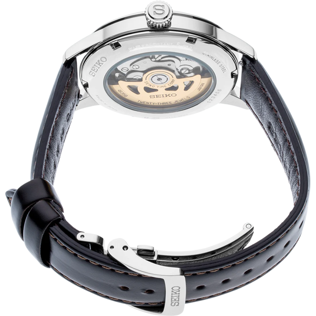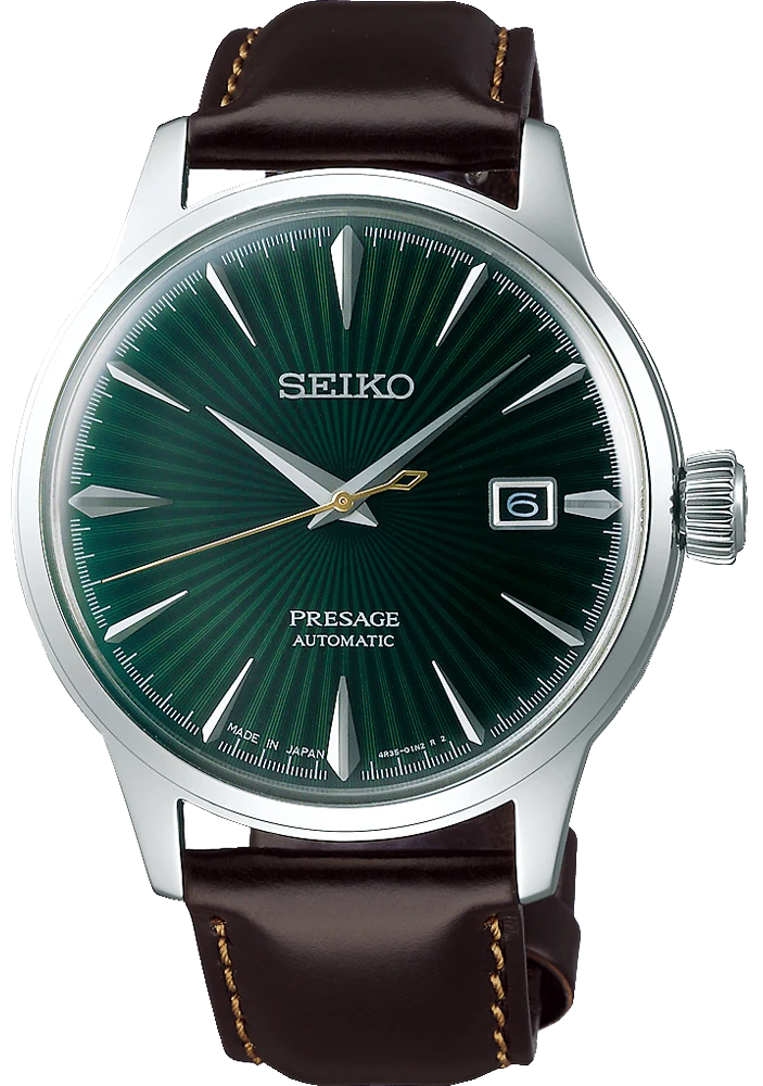 The models in the PRESAGE Cocktail collection are easily recognizable by their sunburst dial with a sunray effect. Their elegant aesthetic simplicity is in perfect harmony with Japanese tradition. The green of the dial of this model is inspired by the color of the "Mockingbird" cocktail, made with tequila, mint liqueur and lime. Paired with a dark brown leather strap for an elegant yet comfortable style, this automatic watch is simply perfect for any occasion.