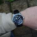 The black unidirectional bezel surrounds a curved Sapphire crystal with AR coating, giving the user complete assurance of durability. Inside we have the Seiko 6R15 Automatic with hacking and hand-winding, a 23 Jewel beating at 21600 BPH, up to 50 hours power reserve. The 43mm case is finely finished with sharp detailing along the edges of the brushed Stainless Steel.