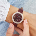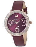 Make a sparkling statement with this extraordinary timepiece, featuring 178 micro-pavé crystals on the bezel. A delightfully expressive burgundy sunray dial, a rose-gold tone PVD stainless steel case, and a burgundy leather strap complete this young and vivacious design. Full of signature Swarovski sparkle and ideal for everyday wear. Specifications: Case – 34 mm; water resistant to 50 m; K1 Mineral Glass; Swiss Made.
