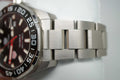 Stainless steel case with a stainless steel bracelet. Uni-directional rotating stainless steel bezel with an inlaid black ceramic ring. Black dial with luminous silver and red hands and index hour markers. Minute markers around the outer rim. Dial Type: Analog. Luminescent hands and markers. Date display at the 3 o'clock position. Caliber 5 Automatic movement with a 38-hour power reserve.