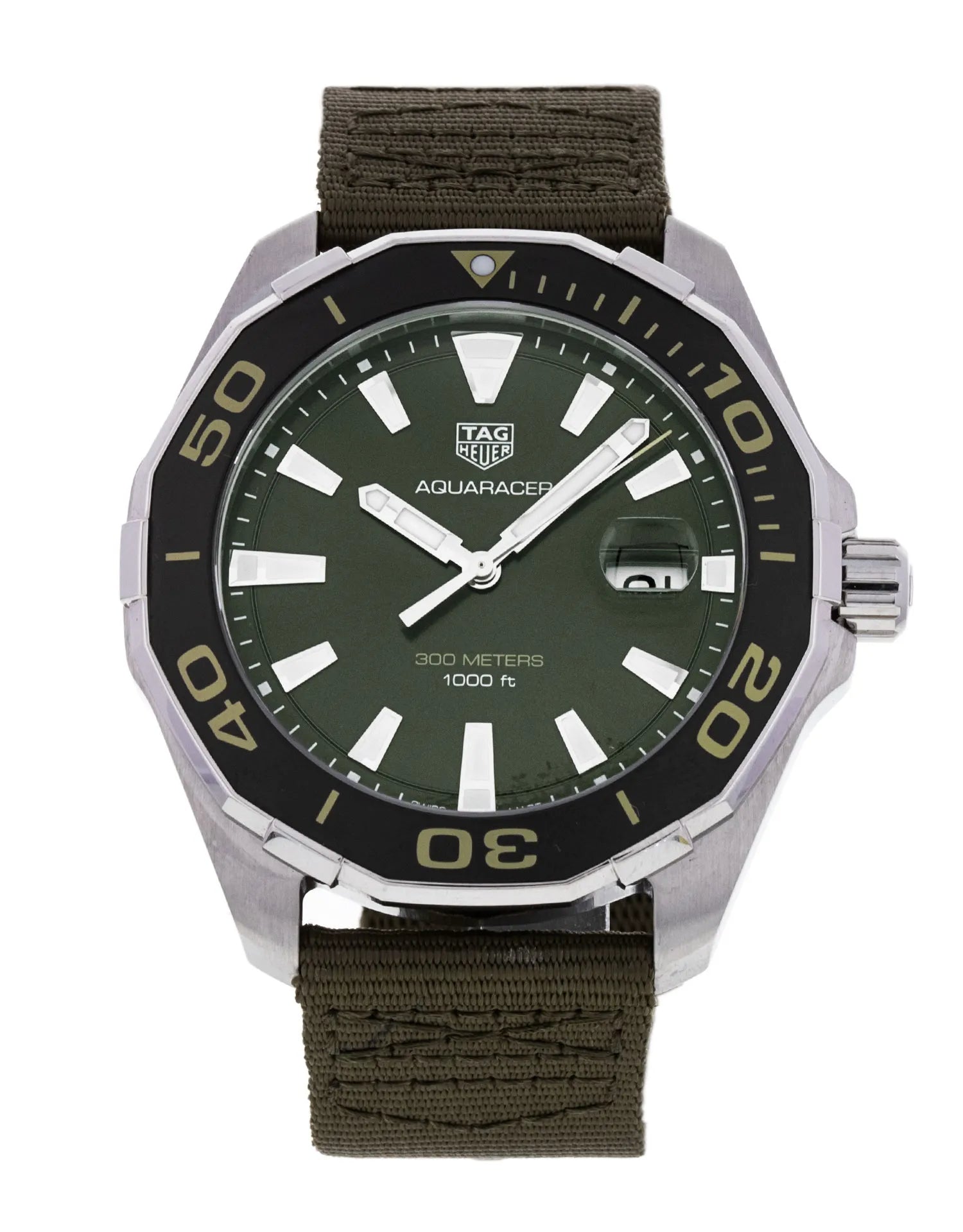 TAG Heuer Aquaracer WAY101E.FC8222 Men's Watch. Features a brushed and polished stainless steel case and comes on a khaki textile strap. A 60 minute scale is located on the anthracite aluminum fixed bezel. The khaki sunray brushed dial features luminescent hour hand, minute hand and hour markers with white SuperLuminova.