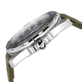 The date is displayed at 3 o'clock under a magnifying lens. Powered by a battery operated quartz movement. The dial is protected by a flat, scratch-resistant sapphire crystal with anti-reflective treatment. The case is round and 43mm in diameter. The crown and case back are screwed down. Stainless steel pin buckle. Water-Resistant to 300 meters / 1000 feet. Functions: hours, minutes, seconds, date. Diving watch style. Swiss Made.
