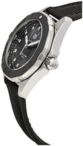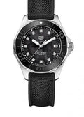 Black Mother of Pearl dial enhanced by luminous silver-tone hands. Silver-tone stainless steel case with a black rubber with black textile inlay band. Quartz movement. 300 meters / 1000 feet water resistance. Uni-directional Rotating bezel. Scratch Resistant Sapphire crystal. Solid caseback. Fold Over with Push Button Release clasp. Screw Down crown. Case size 35 mm. Band 17 mm x long. Tag Heuer WAY131M.FT6092 Aquaracer Watch.