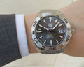 Polished and satin-finished stainless steel case, case diameter 41 mm, unidirectional rotating stainless steel bezel with 60-minute scale and luminous dot, satin-finished stainless steel strap with folding clasp, grey dial with applied luminous indexes, luminous hands, automatic movement, TAG Heuer 5 calibre, date display with quick adjustment, sapphire crystal, screw-down crown with side protection, screwed and engraved stainless steel case back, water resistant up to 30 bar.