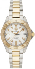 Adding a generous dose of glamour to the Aquaracer collection, this TAG Heuer Aquaracer Ladies’ Watch offers exceptional performance, presented within a 32mm stainless steel case with a stunning 18ct gold-plated unidirectional bezel. Driven by a Swiss-made quartz movement, the white mother of pearl dial is enhanced by striking gold-toned hands and baton hour markers with a luminescent coating, a date window at 3 o’clock and a printed logo at 12 o’clock. Water resistant to an impressive 300 meters, this elegant watch fastens with a stainless steel and 18ct gold bracelet.