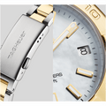 Stainless steel case with a stainless steel bracelet with 18kt yellow gold center links. Uni-directional rotating 18kt yellow gold bezel. Mother of pearl dial with luminous yellow gold-tone hands and index hour markers. Minute markers around the outer rim. Dial Type: Analog. Luminescent hands and markers.