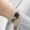 A petite case (27mm) in alternate-finished stainless steel and a gorgeous black sunray-brushed dial set this sporty woman’s watch apart. The rhodium-plated indexes, hour and minute hands are treated with Super-LumiNova®, to enhance legibility in all light conditions. The sunray-brushed dial, with its polished elements, is protected by a flat sapphire crystal with an anti-reflective treatment. The ergonomic 3-row bracelet, a pleasure to wear, is forged from stainless steel, alternate-finished to capture and play with the light.