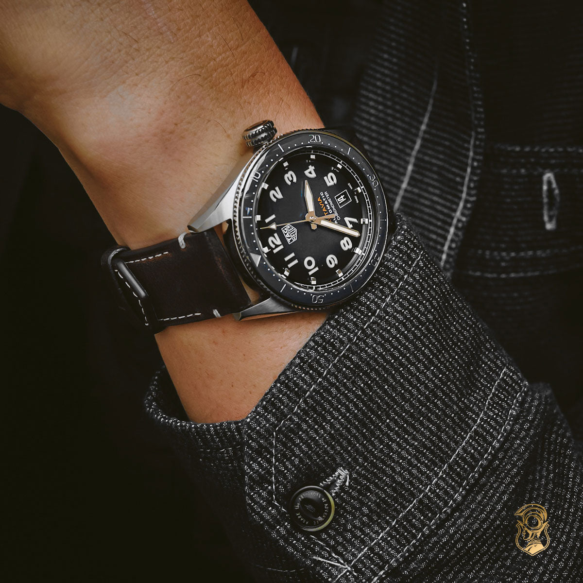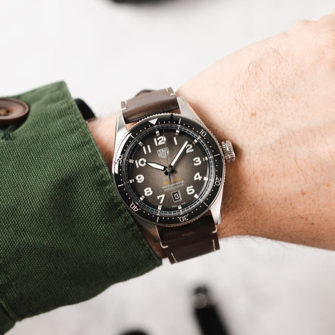 The oversized crown, Arabic numerals and sword-shaped hands take inspiration from Heuer pilot watches and timers from 1933 to 1957. The dial is smoked brown, the ceramic 60-minute bezel rotates bi-directionally. The rounded stainless-steel case and beveled lugs echo those of the Autavia from the 1960s.