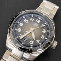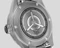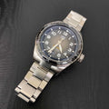 The 42mm case is solid stainless steel, hand polished and fine brushed to catch the light. A curved sapphire crystal with double anti-reflective treatment provides water resistance to 100 meters. The strap’s steel folding clasp has double safety pushbuttons to avoid accidental opening.
