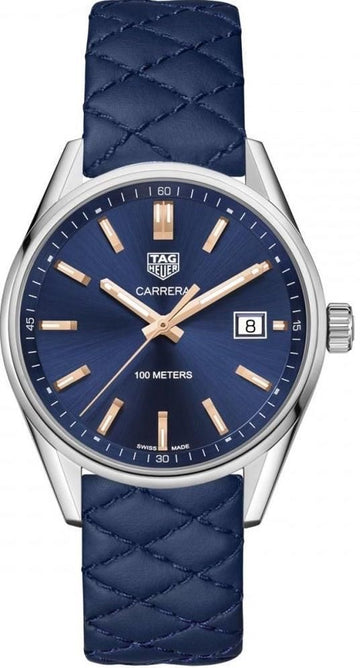 Brand New Authentic Tag Heuer Carrera Quartz Blue Dial Leather Strap Women's Watch Model WAR1112.FC6391. Stainless Steel Polished case with Blue Leather Calfskin strap. Deployment with Push Button and Foldover clasp. Fixed bezel. Dial description: Blue with Rose gold minute and hour hands on dial. Swiss Quartz movement. Watch functions: Date, Hour, Minute, Second. Screw in crown. Scratch Resistant Sapphire crystal. Case size: 39mm. Solid case back. 100 Meters - 330 Feet water resistant. 2 year warranty.