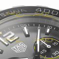 The tachymeter fixed bezel is in black ceramic, circular brushed to perfection. Under the hood, a TAG Heuer Swiss quartz movement.