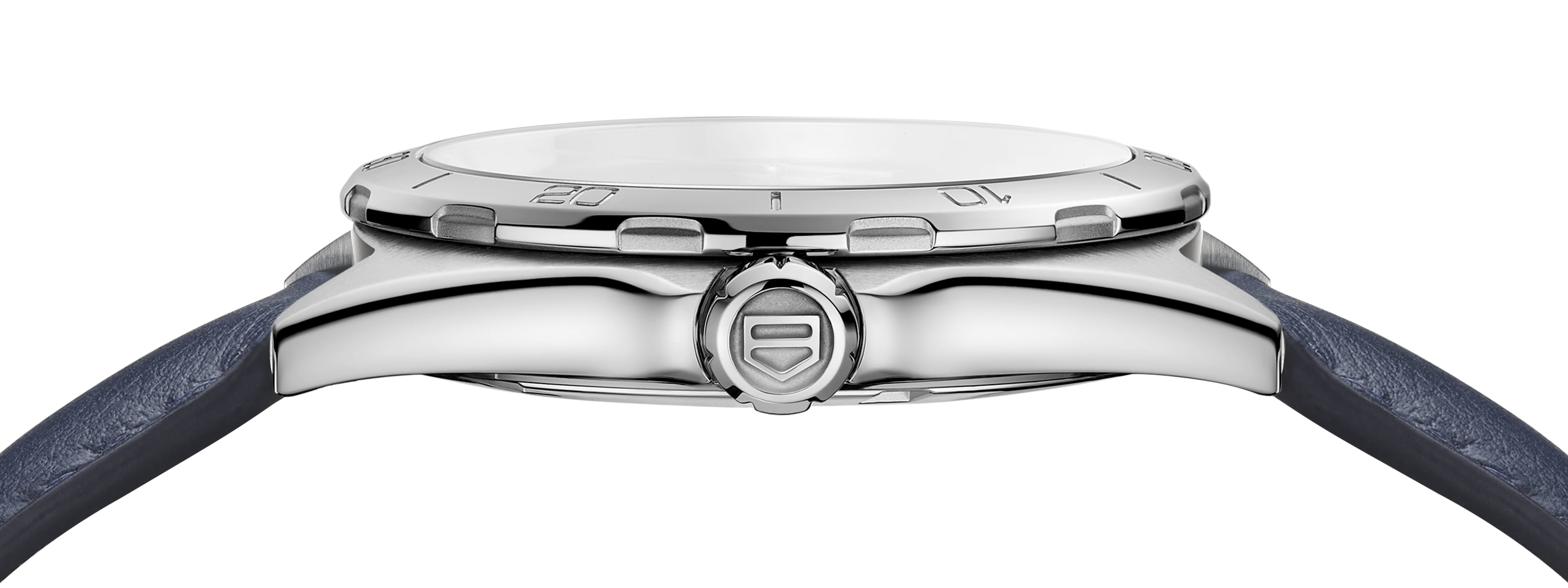 Discover the TAG Heuer world of Swiss precision and avant-garde design with this classic Formula 1 wristwatch. The 35mm watch case is forged in high-grade stainless steel and fronted with a handsome blue dial, hand-brushed for maximum luster. The matching blue strap is in supple calfskin with beige top-stitching and lining.