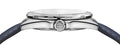 An understated, very sophisticated quartz watch with sunray-brushed blue dial and matching matte blue calfskin strap. Silver tones on the dial contrast with its sunray-brushed blue, which changes shades depending on the angle of the wrist.