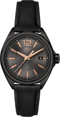 Black PVD stainless steel case with a black (calfskin) leather strap. Fixed polished black PVD bezel. Black dial with rose gold-tone hands and index hour markers. An Arabic numeral appears at the 12 o'clock position. Minute markers around the outer rim. Dial Type: Analog. Date display at the 3 o'clock position. Quartz movement. Scratch resistant sapphire crystal. Pull / push crown. Solid case back. Round case shape. Case size: 32 mm. Band width: 20 mm. Tang clasp. Water resistant at 100 meters / 330 feet. Functions: date, hour, minute, second. Casual watch style. Watch label: Swiss Made. Tag Heuer Formula 1 Quartz Ladies Watch WBJ1414.FC8234.