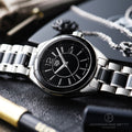 A slim and glamourous women’s watch with black steel and ceramic fixed bezel matched by a two-toned steel and black ceramic bracelet. For confident women who seek superlative craftmanship and eye-catching design.