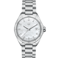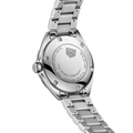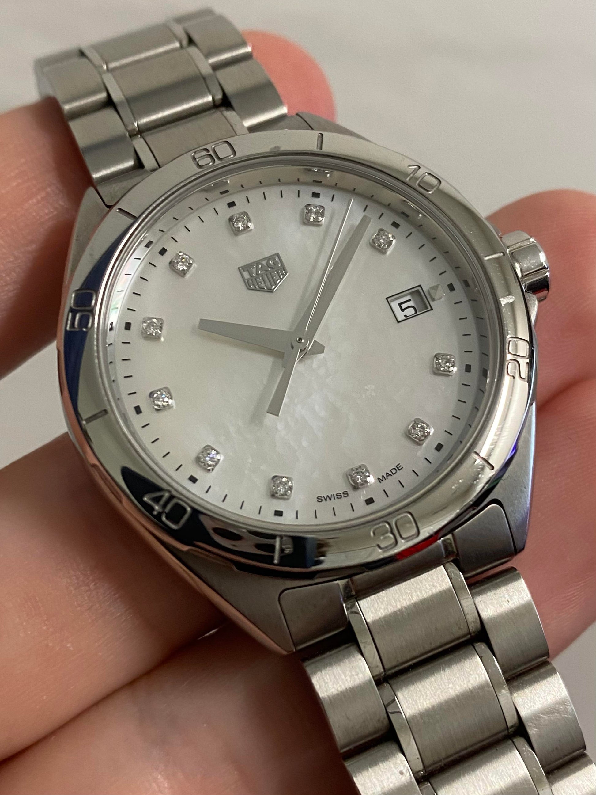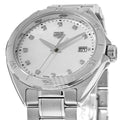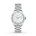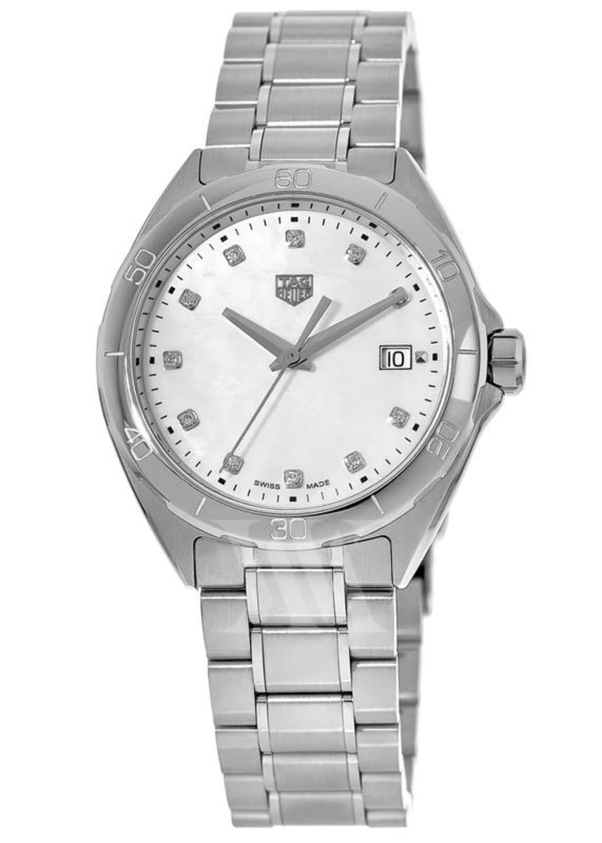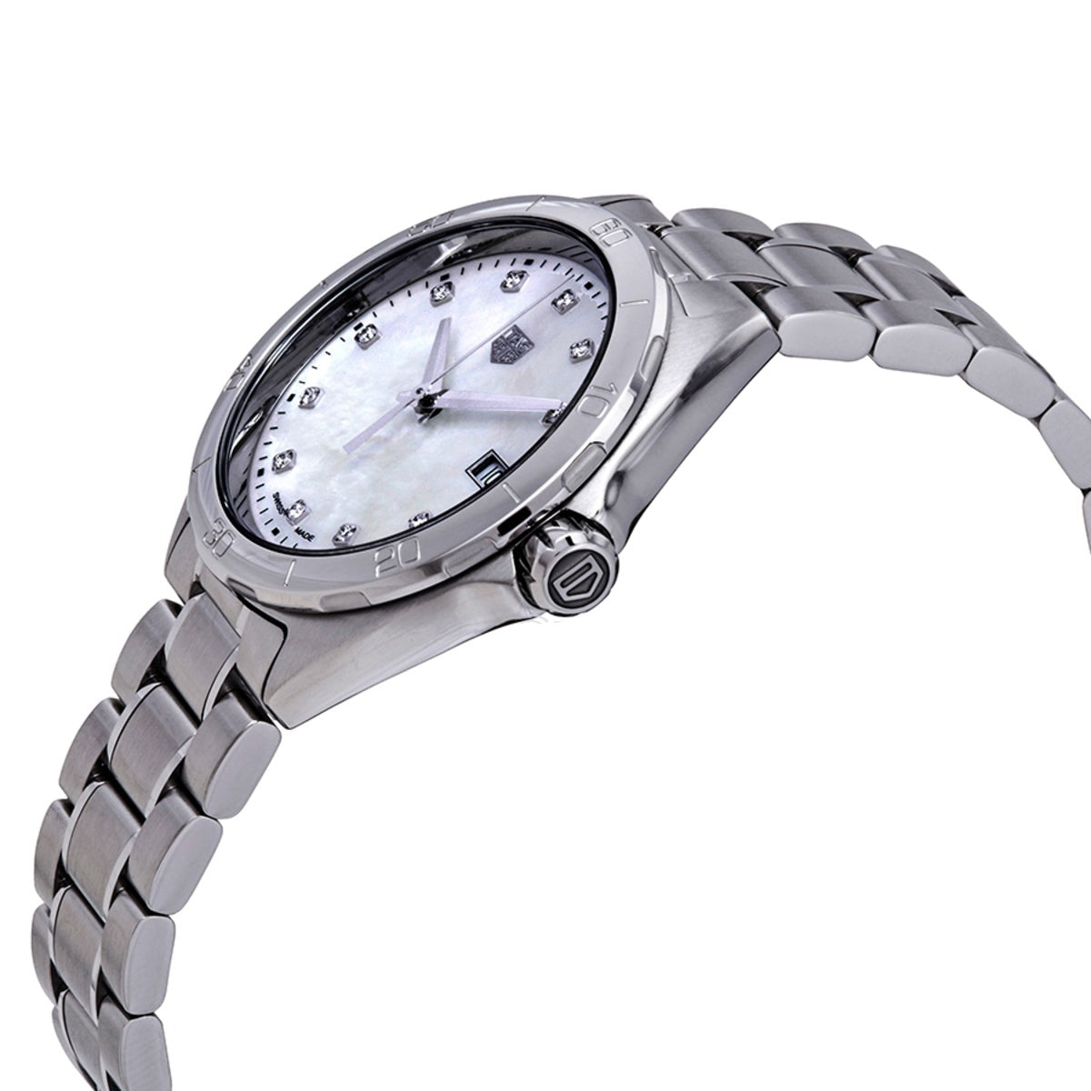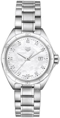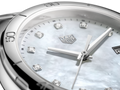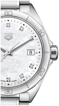 Crystal sapphire harder than steel protects voluptuous mother-of-pearl dial, which has silver-toned hands and a silver polished TAG Heuer logo. Shimmering diamonds mark the hours.