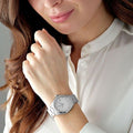Showcased in a sapphire crystal glass lens and powered by Quartz Movement, this timepiece features a date display window at 3 o ‘clock, a 35mm steel case, a high shine silver bracelet strap, a single dazzling diamond punctuated at each of the hour markers and a striking mother of pearl dial that is truly exquisite.